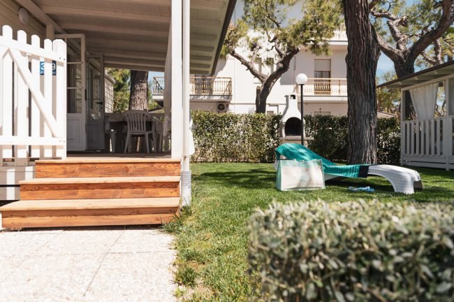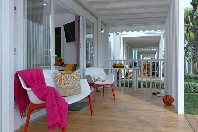 Area giorno con angolo cottura, camera da letto matrimoniale, camera con 2 letti singoli ed 1 a bandiera, bagno con doccia, Tv, climatizzatore e veranda esterna con giardino privato. Il alcune tipologie di Casemobili è presente l'asciugacapelli.