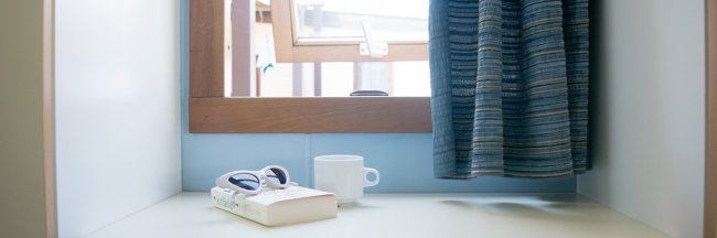 Finestra aperta, occhiali e tazza su un tavolo.