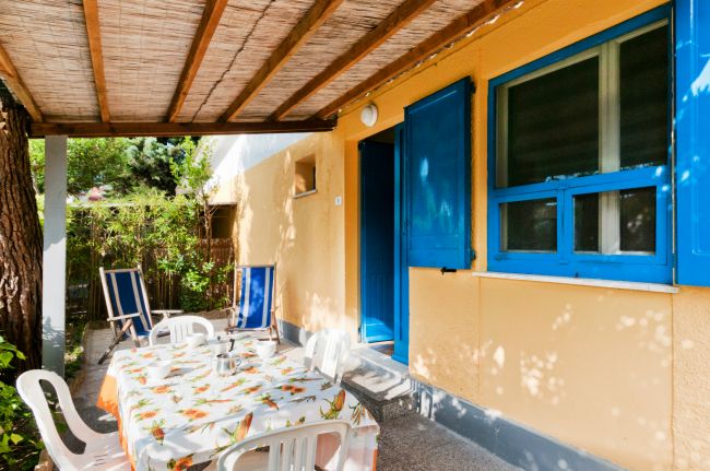 composto da camera matrimoniale, soggiorno-pranzo con angolo cottura completo di attrezzatura da cucina e frigo grande, TV, bagno con wc, lavandino e doccia calda, veranda con pergolato, giardino e parcheggio auto riservato. Seconda camera con letti singoli in base al numero di persone. Aria condizionata disponibile in alcuni alloggi, a pagamento.