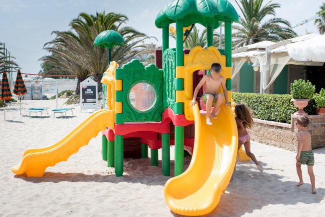Bambini giocano su uno scivolo colorato su una spiaggia.