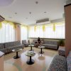 Sala d'attesa con divani colorati, tavolini e finestre luminose. Due persone sedute.